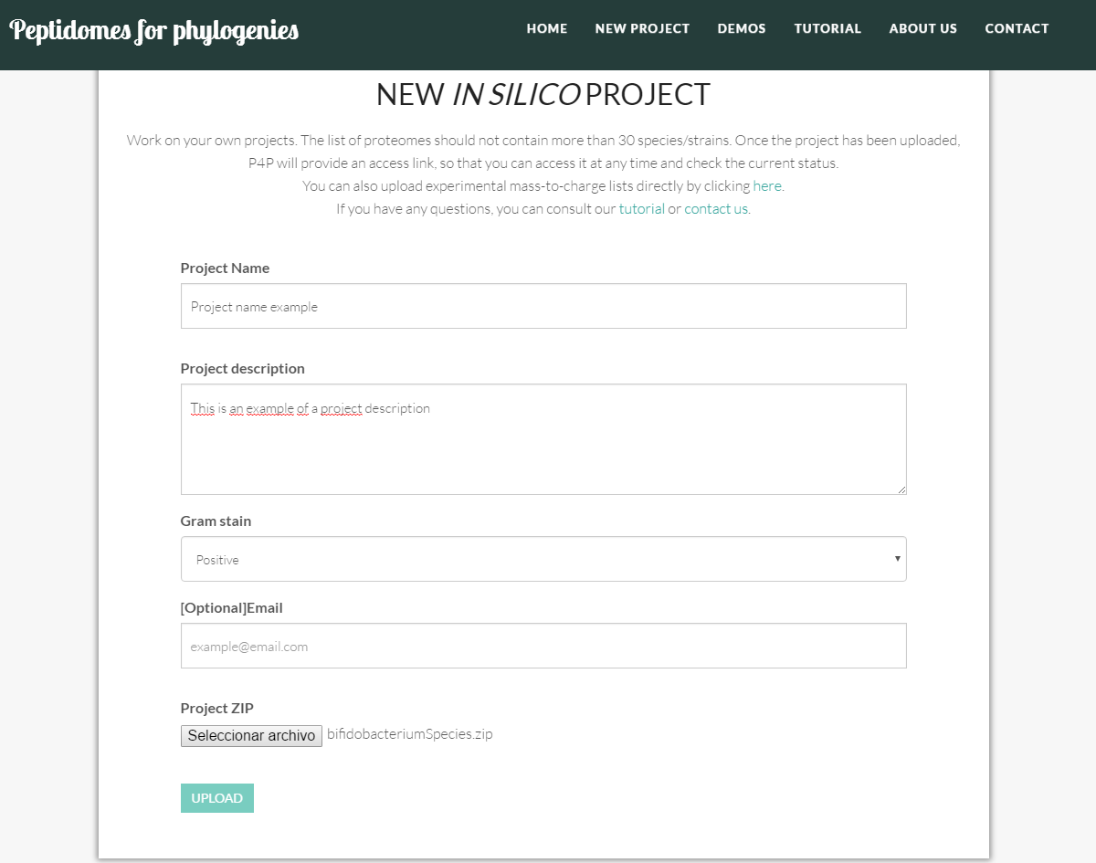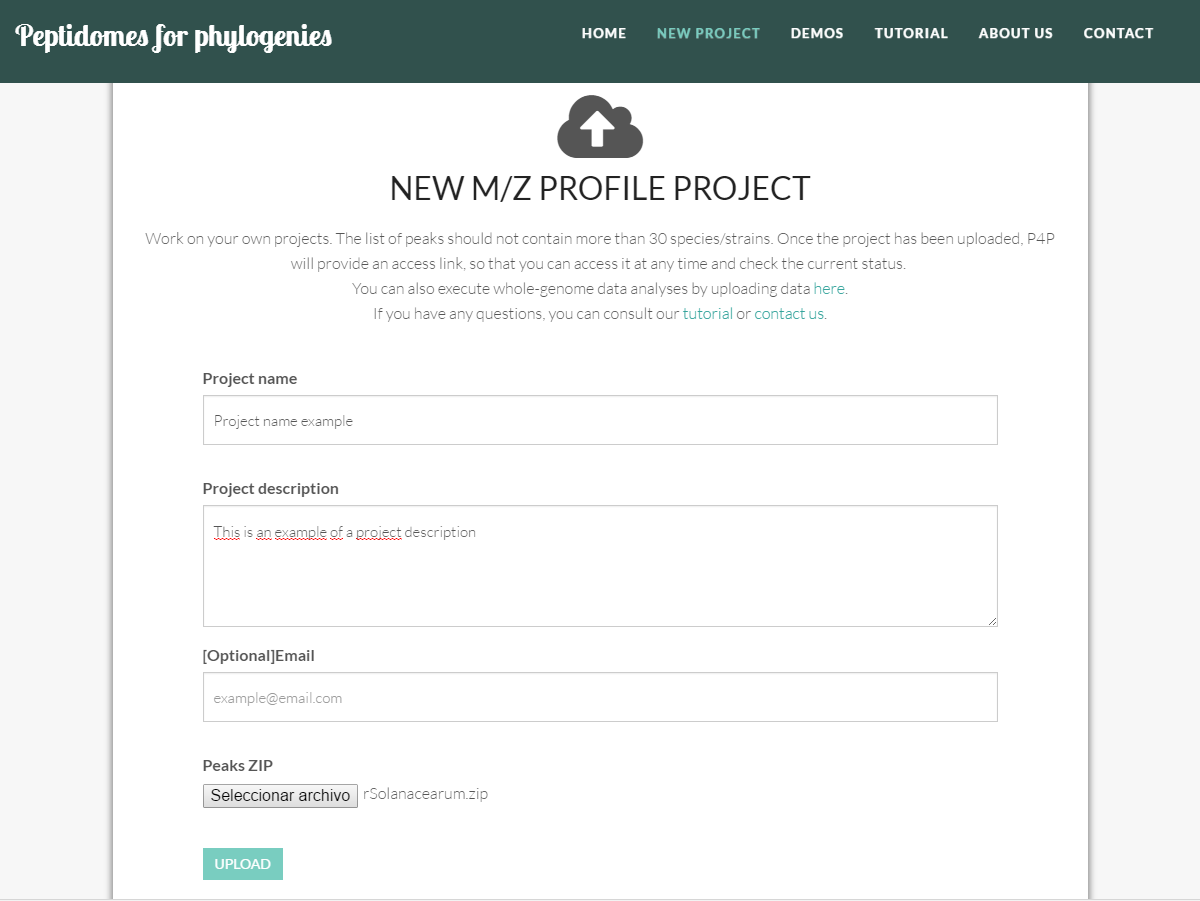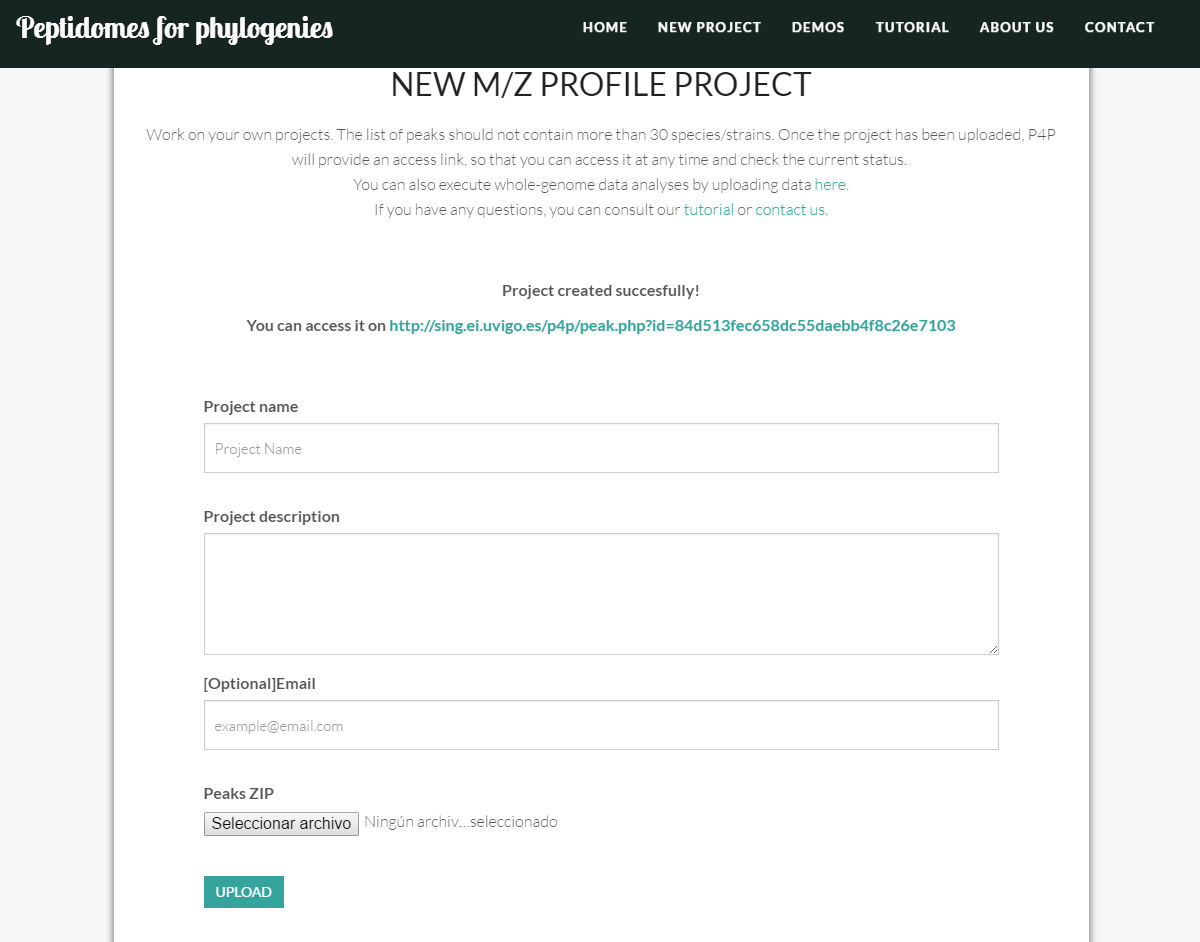- Email: [Optional] the email of contact to send the project link and the process updates. This field is optional, because once the project has successfully been uploaded, the tool provides a link (such as http://sing.ei.uvigo.es/p4p/peak.php?id=8d8e723dc51c5fe7791a45df6d42c4e2) for you to monitor the progress of the project at any time.