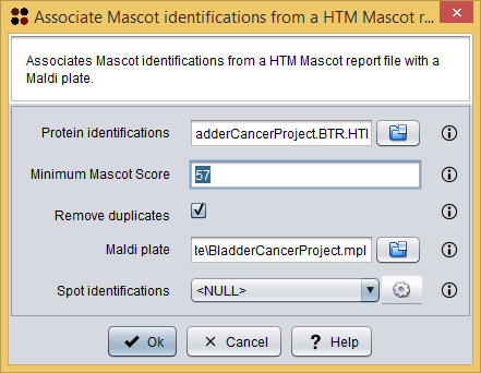 This procedure can be done using the menu Operations/Associate Mascot identifications from a Mascot HTM report file (), which will show you the Associate Mascot identifications dialog. As you can see in the following image, this dialog requires you to provide the following information: