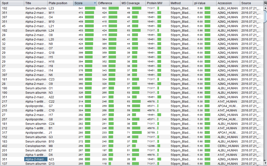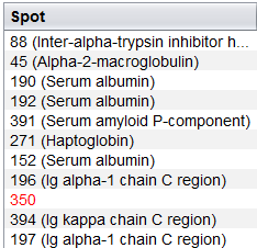 After adding this information to the analysis, tables will automatically show the best Mascot identification (i.e. that with a higher Mascot Score) along with the spot number or mark in red those spot without identifications associated.