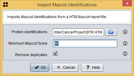 S2P allows you to import protein identifications from a Mascot report (HTML file). The report that we are going to load for this tutorial is included with the sample data at Mascot identifications/2016.07.21_BladderCancerProject.BTR.HTM.