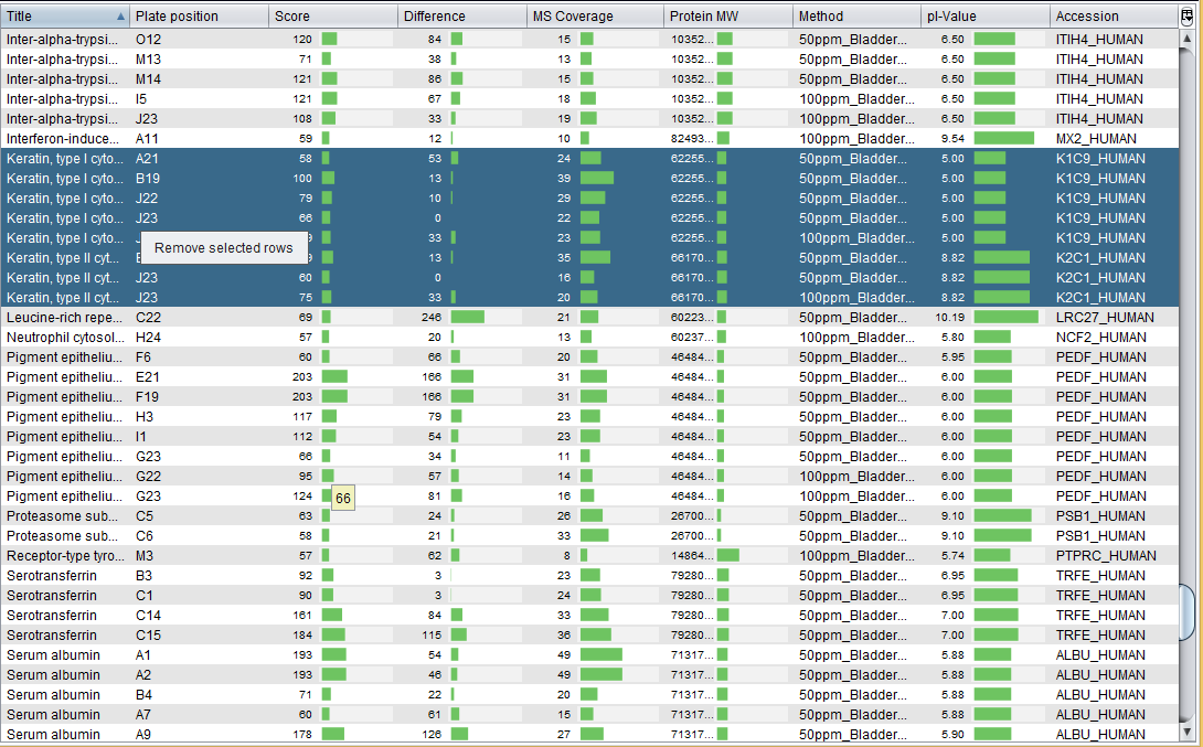As the image above shows, S2P allows you to remove protein identifications (e.g. Keratins, which can be result of contamination). Finally, we have exported this data into a CSV file, which is provided with the sample data at Mascot identifications/2016.07.21_BladderCancerProject.csv. If you want to load this CSV file, note that this CSV has a `Custom format` where fields are quoted, `,` is the column separator, `.` is the decimal separator, and `Windows` is the line break.