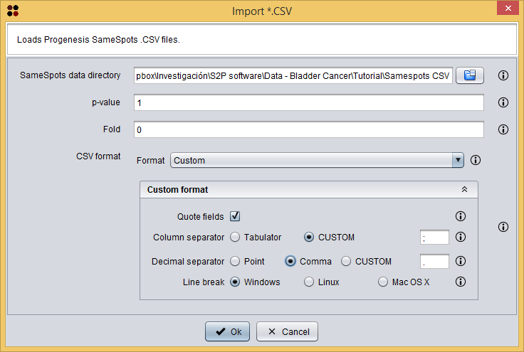 In order to import this data into S2P you have to do the same that you have done to import a Progenesis SameSpots report but using the menu Import/Samespots/Import *.CSV () instead. This option will show you the following dialog, were you also have to choose the format of the CSV files (`Custom format` where fields are quoted, `;` is the column separator, `,` is the decimal separator, and `Windows` is the line break). Please, note that you must select the directory Samespots CSV provided in the sample data and not each individual file inside this directory.