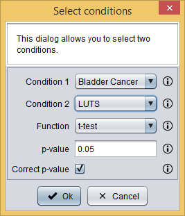 Since we have expression values for all samples, we can perform a t-test to check if there are spots whose average mean is statistically different between Bladder cancer and LUTS. This can be done by clicking the button , which will show you the following dialog. As you can see in the image bellow, it requires you to provide the following information: