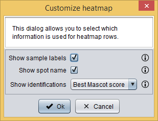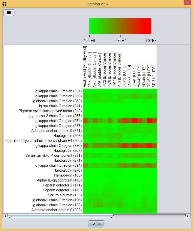 By doing this, only spots whose average mean is statistically different between Bladder cancer and LUTS are shown in the table. Now, you can visualize this information as a heatmap by clicking the button and then selecting the View as heatmap option, which will show you a dialog to customize the heatmap information. As you can see in the image bellow, it requires you to provide the following information: