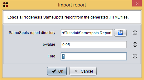 These reports can be imported into S2P using the menu Import/Samespots/Report from HTM files (), which will show you the Import SameSpots report dialog. As you can see in the following image, this dialog requires you to provide the following information: