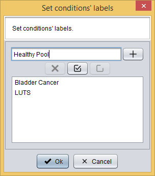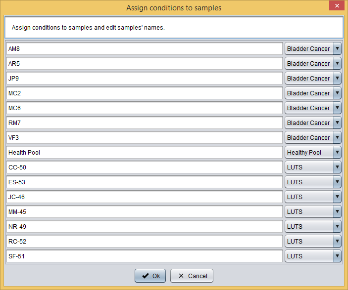 Secondly, you have to assign each sample to one condition and edit samples' names by clicking the button, which will show you the following dialog where you can do this.