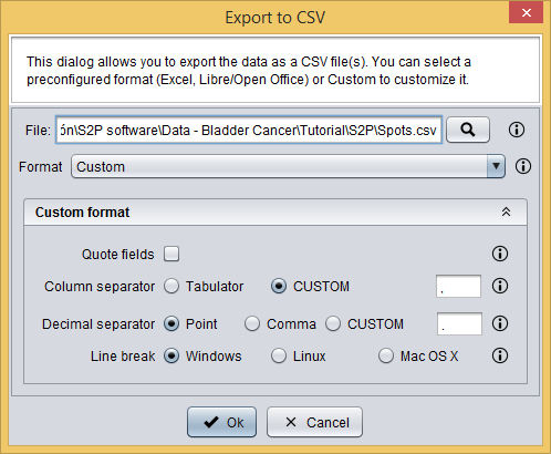Finally, you have to export the prepared spots data into a CSV file by clicking the button, which will show you the following dialog. This dialog allows you to select a file to save your data as well as to define the CSV format.