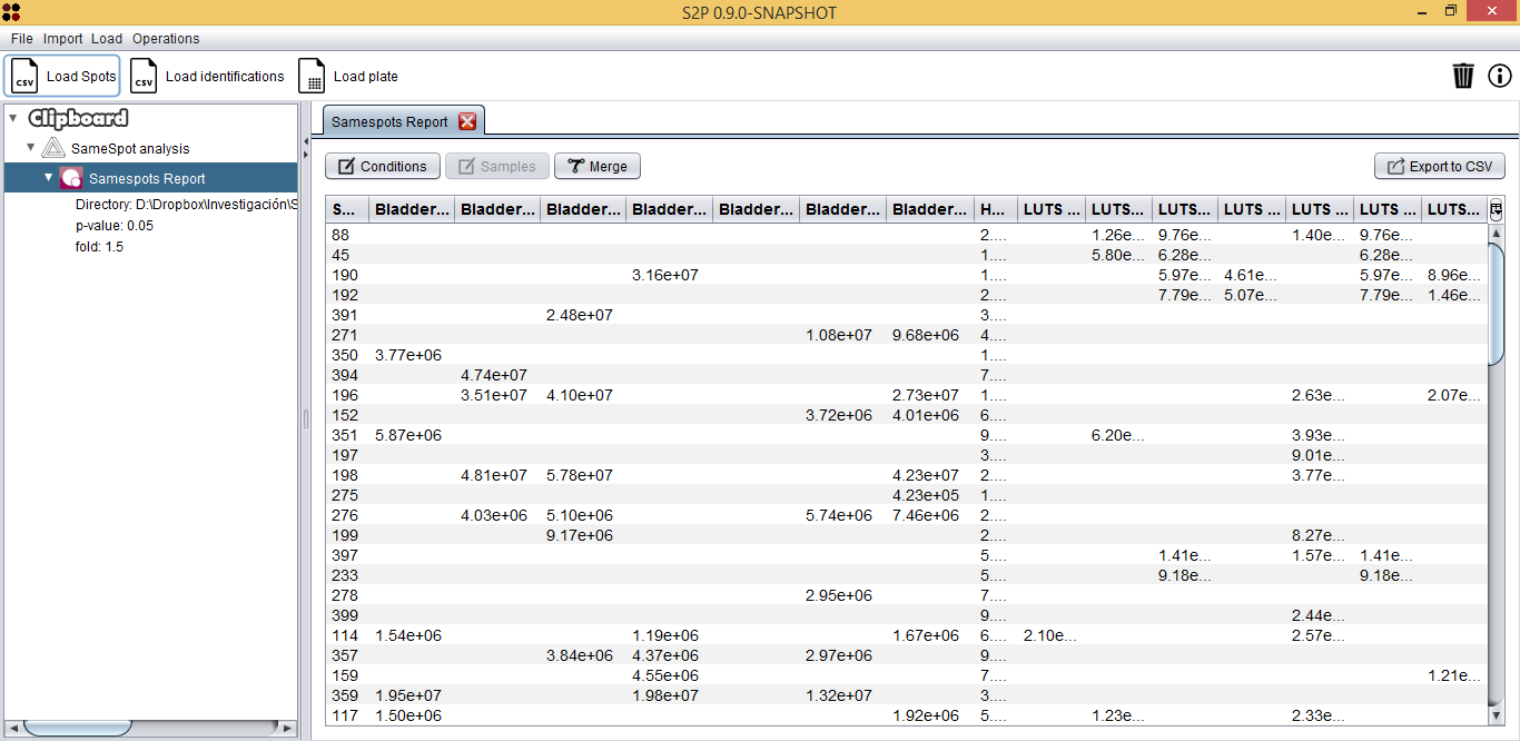 Once the reports have been imported, the SameSpots analysis editor is opened. This interface allows you to: edit spots identifiers, define the experiment conditions, assign them to samples, edit samples' names, merge samples and export the spots into a CSV file.