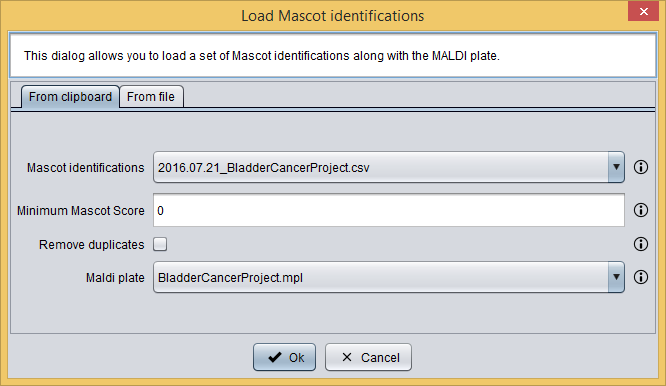 Now, in order to integrate the Mascot identifications into this analysis you should click the button, which will show you the Add identifications dialog. As you can see in the following image, this dialog allows you to select a pair of previously loaded Mascot identifications and MALDI plate.