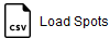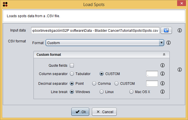 Once spots are exported into a CSV file, this new data is automatically opened by S2P. This file is also provided with the sample data at Spots/Spots.csv and it can be opened by using the button, which will show you the Load Spots dialog. This dialog just requires you to provide the *.CSV file of the spots and the CSV format of the file. In the case of the Spots/Spots.csv file, it has a `Custom format` where fields are not quoted, `,` is the column separator, `.` is the decimal separator, and `Windows` is the line break.