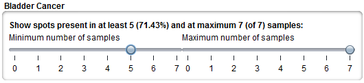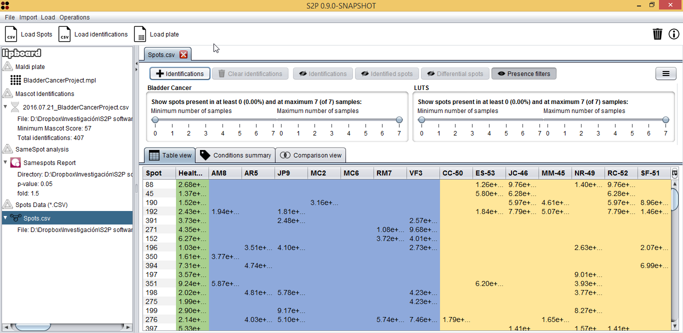 Regarding the Table view, one of the first useful things is finding spots that are present in one condition and not in the other by using the sliders upper the table. In our case, for example, it would interesting to check if there are spots that are in at least five of seven Bladder cancer samples, so we used the slider to establish this filter.