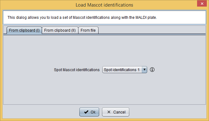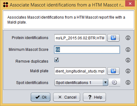 MALDI plates and Mascot identification files can be associated to create a Spot identifications data. This associated set of spots can be integrated later into the Integrated analysis view and saved as a CSV file. This is useful in experiments involving several MALDI plates and Mascot identification reports as it is the case of this dataset.