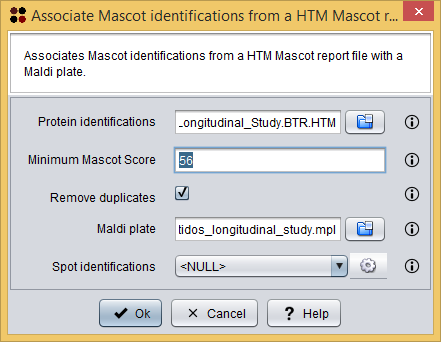 After the association of the first MALDI, you must associate the remaining one. To do so, use menu Operations/Associate Mascot identifications from a Mascot HTM report file () again in order to show the Associate Mascot identifications dialog. As you can see in the following image, this dialog requires you to provide the following information: