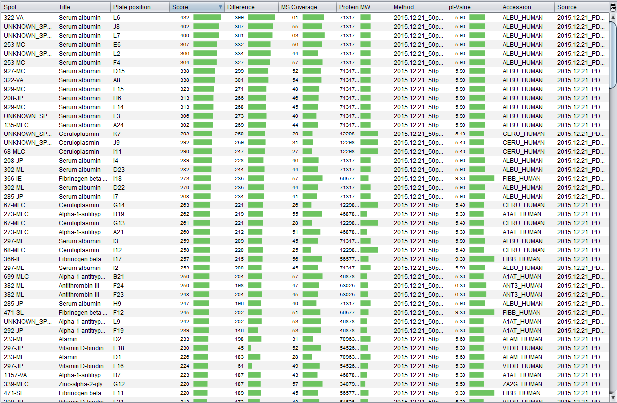 After adding this information to the analysis, tables will automatically show the best Mascot identification (i.e. that with a higher Mascot Score) along with the spot number or mark in red those spot without identifications associated.