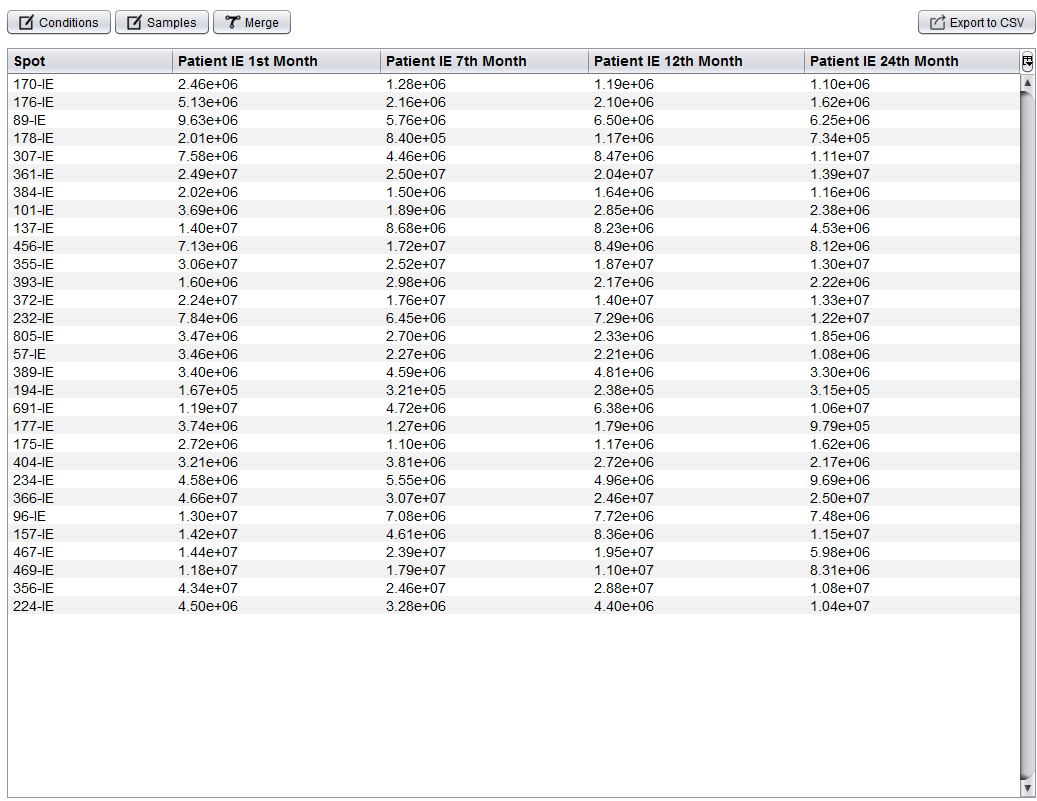 Finally, we have exported patient's spot data along with the corresponding identifications into a CSV file by clicking the button and then selecting the Export to CSV with identifications option. Files exported these way are provided in directory Processed Spots/CSV/ of the sample data.