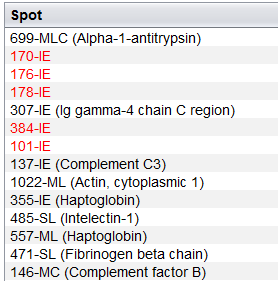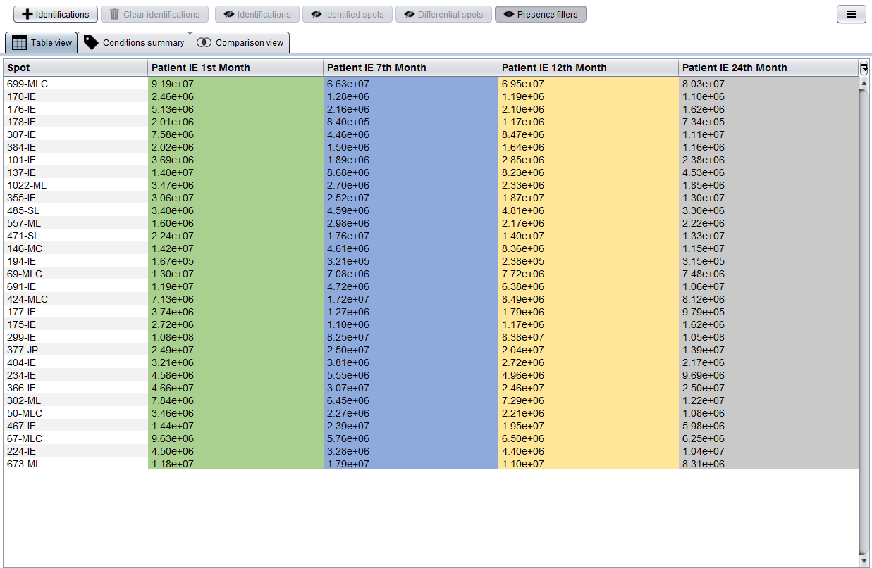 At this moment you have loaded two types of data: spots and and associated Mascot identifications. By clicking on the Patient IE.csv item the Integrated analysis view will be opened. A detailed description of this view can be found in the equivalent section of the first case study tutorial.