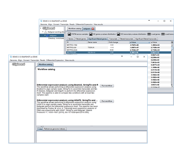 DEWE offers built-in, easy-to-configure workflows that facilitate the execution of DE analyses. Currently, DEWE provides two differential expression analysis workflows: HISAT2, StringTie and R libraries (Ballgown and edgeR) and Bowtie2, StringTie and R libraries (Ballgown and edgeR).