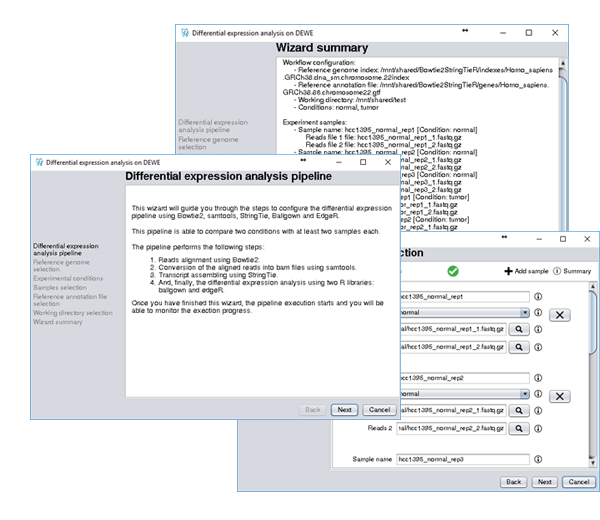 DEWE offers built-in, easy-to-configure workflows that facilitate the execution of DE analyses. Currently, DEWE provides two differential expression analysis workflows: HISAT2, StringTie and R libraries (Ballgown and edgeR) and Bowtie2, StringTie and R libraries (Ballgown and edgeR).
